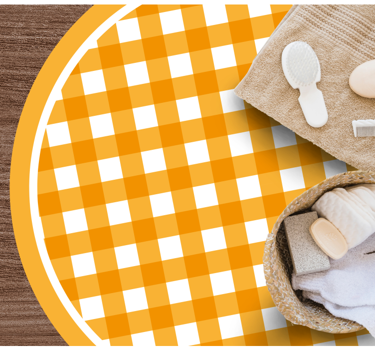 Referencia: R19703Un patrón a cuadros vibrante y cálido presenta cuadrados alternos en naranja y blanco, creando un efecto juguetón pero reconfortante. El diseño es circular, bordeado con un contorno sólido en naranja, lo que contribuye a una apariencia alegre que destaca.