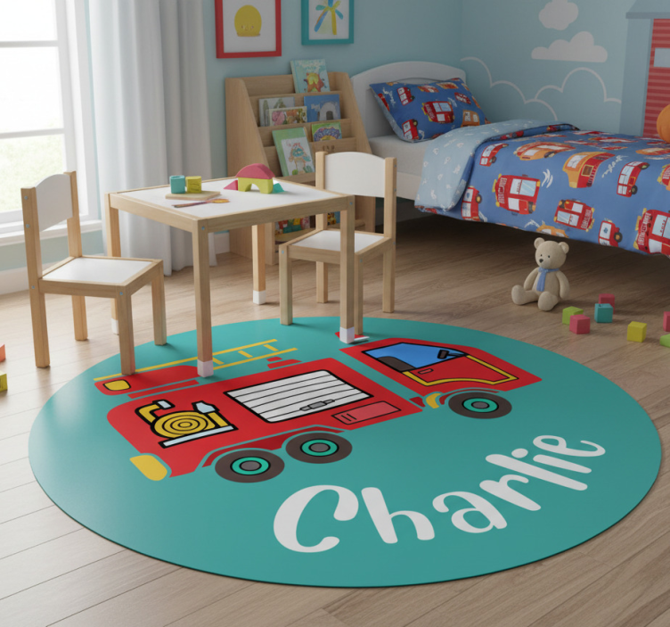 Alfombra vinílica infantil camión de bomberos personalizado