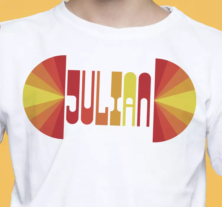 Referencia: T4236Esta pieza elegante presenta una exhibición de nombre vibrante en tipografía en negrita. El diseño incorpora colores cálidos que irradian en un patrón circular, creando un punto focal llamativo. Ideal para mostrar individualidad y un sentido del estilo.