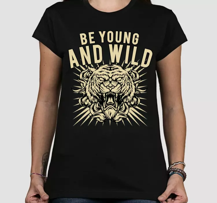 Referencia: T4848Este diseño presenta una poderosa cabeza de león con una tipografía audaz que muestra la frase 'Be Young and Wild'. La feroz expresión del león transmite una sensación de fuerza y aventura, convirtiéndolo en una elección impactante para aquellos que buscan expresar su lado salvaje.
