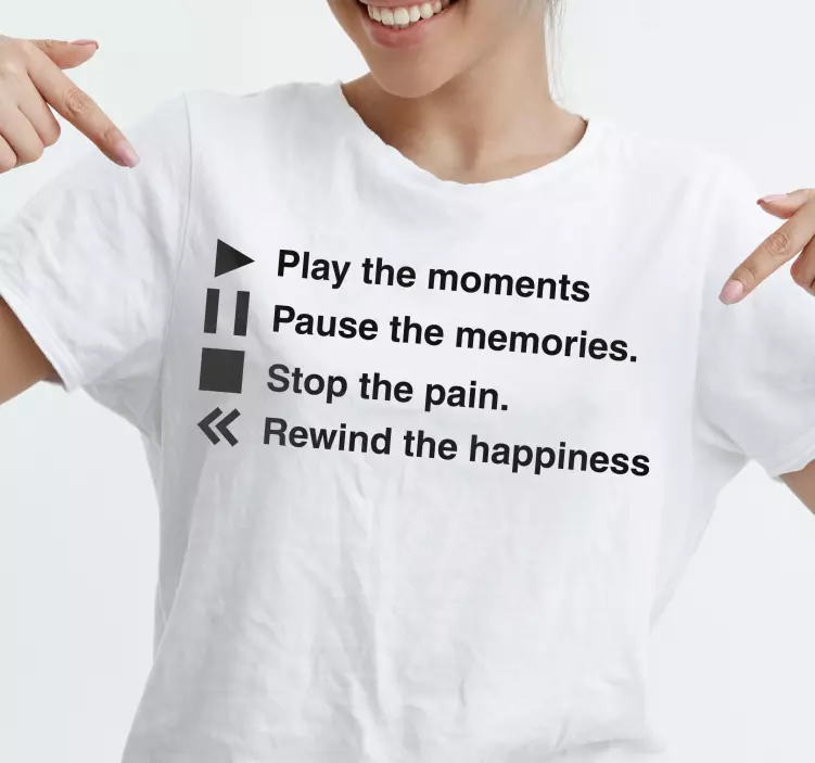 La camiseta momentos de felicidad es una pieza única que captura la esencia de las emociones a través de un diseño gráfico en blanco y negro. Con elementos que evocan la acción de tocar, pausar y detener, cada lema y cita motivacional en inglés está diseñado para recordarte esos instantes de felicidad que atesoramos en la memoria. ¡Luce un mensaje inspirador que resuena con cada quien que la vea!
