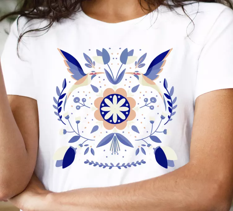 La camiseta motivo de pájaro floral es una obra maestra que combina la esencia de la naturaleza con un diseño decorativo y vistoso. Con un estilo caprichoso y elegante, esta prenda presenta un hermoso motivo de pájaros que se entrelazan con flores, evocando un aire de folklore tradicional. Perfecta para quienes aman la naturaleza y desean llevar un pedazo de ella consigo, esta camiseta es ideal para cualquier ocasión.