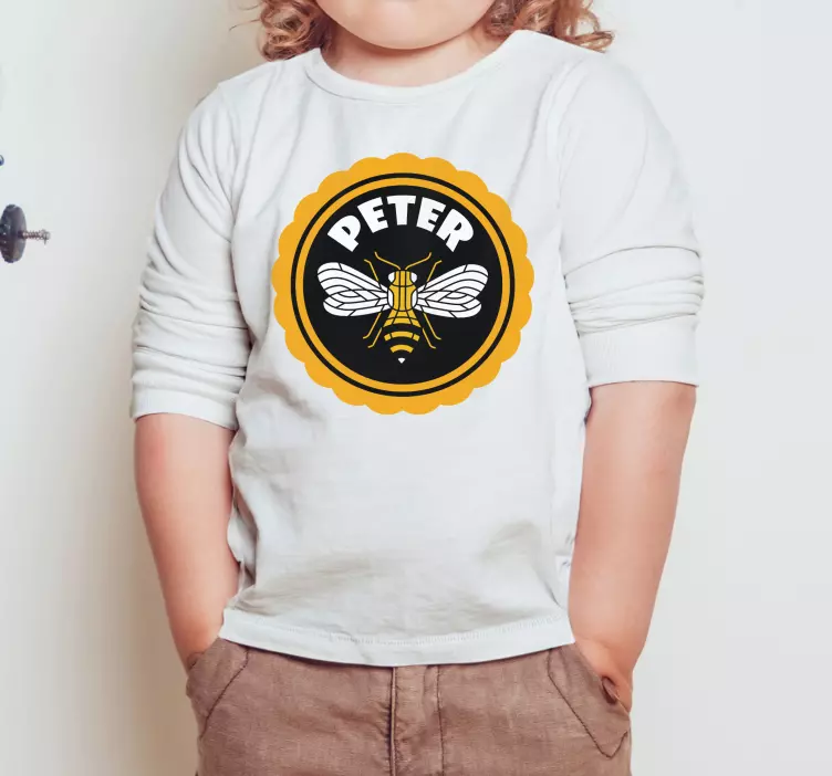 Referencia: T4984Este encantador diseño presenta una vibrante ilustración de una abeja rodeada por un audaz borde amarillo con forma de concha. El nombre 'Peter' exhibido de manera prominente añade un toque personalizado, haciéndolo perfecto para los niños. La combinación de colores juguetones y un motivo atractivo crea un aspecto llamativo para la ropa infantil.
