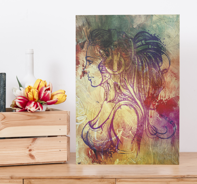 Referencia: Q6417Una cautivadora silueta de perfil de una mujer con cabello ondulante, intrincadamente ilustrada contra un fondo texturizado. El diseño captura la esencia de la feminidad mientras muestra un detallado trabajo de líneas y vibrantes salpicaduras de color, creando una mezcla armoniosa de arte y expresión.