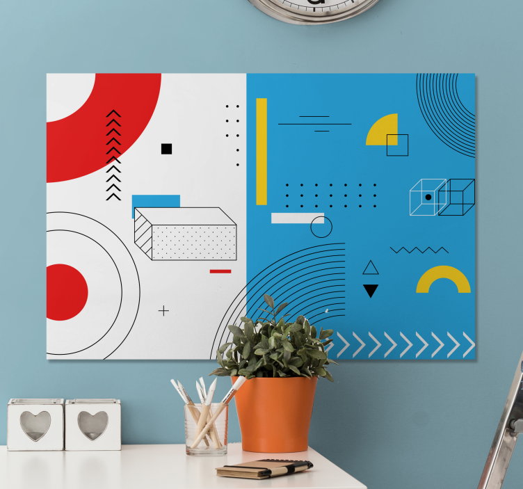El Cuadro figuras geométricas composición de formas es una obra de arte abstracta que resalta por su ingenioso uso de la geometría. Con un diseño que incluye círculos, triángulos, rectángulos, flechas y topos, este cuadro se convierte en un auténtico festín visual. Su patrón y estampado aportan un aire moderno y vibrante a cualquier espacio, convirtiéndolo en una pieza central que atrae todas las miradas.