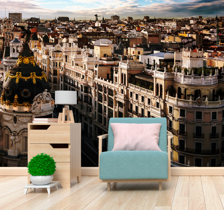 El fotomural de Madrid Gran Vía con nubes al atardecer es el accesorio perfecto para darle a tu sala de estar, dormitorio, baño o incluso cocina un toque único.