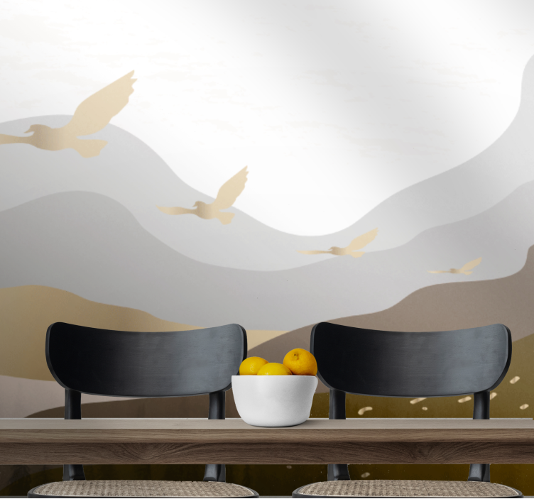 Descubre la belleza de la naturaleza con nuestro Mural de naturaleza siluetas de aves volando, un diseño que captura la esencia de la vida silvestre. Esta hermosa ilustración presenta silhuetas de aves en vuelo, enmarcadas por majestuosas montañas y sumergidas en tonos dorados. La combinación de la naturaleza y el arte se fusiona en este mural, creando un espacio acogedor y lleno de vida.