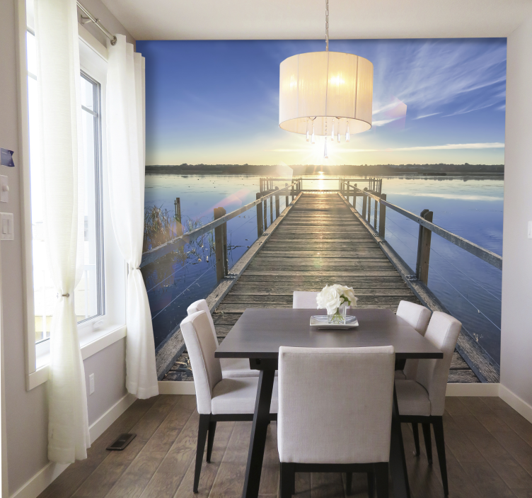 Descubre la magia de nuestro Mural de paisajes vista del atardecer en el muelle, una obra que cobra vida con un impresionante efecto 3D. Este mural transporta tu espacio a un sereno atardecer, donde el cielo azul se funde con el reflejo del agua en el muelle. La imagen de una pasarela que invita a la contemplación y una ruta que se pierde en el horizonte, hacen de este mural una opción ideal para aquellos que buscan un toque de naturaleza en su hogar.