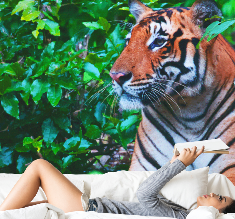 Sumérgete en la belleza del mural de selva tigre majestuoso mirando, una impresionante representación gráfica que captura la esencia de la naturaleza. Este diseño vibrante presenta un bosque exuberante, hojas verdes que dan vida al espacio y un tigre majestuoso que observa con su mirada intensa. Es una obra de arte que celebra la fauna silvestre y transforma cualquier ambiente en un santuario natural.