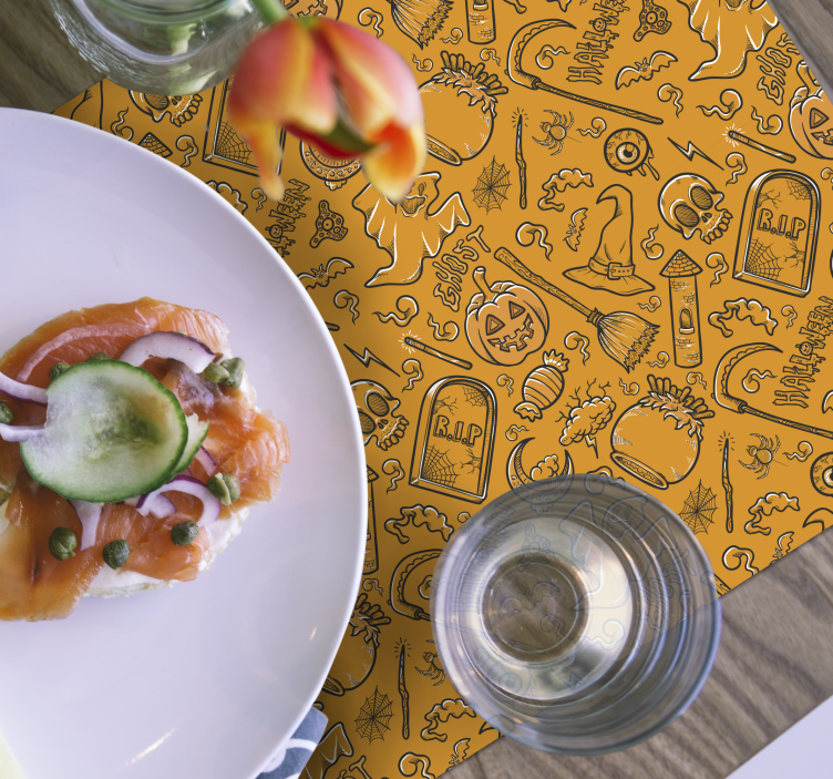 ¡Descubre la magia de la Víspera de Todos los Santos con nuestro mantel individual Halloween motivos espeluznantes! Este encantador diseño presenta un vibrante patrón en tonos de naranja, adornado con inquietantes dibujos de fantasmas, calaveras, calabazas, arañas y lápidas. Perfecto para agregar un toque festivo a tu celebración, este mantel es una opción ideal para tus reuniones familiares y fiestas temáticas. ¡Deja que la diversión de Halloween inunde tu mesa!