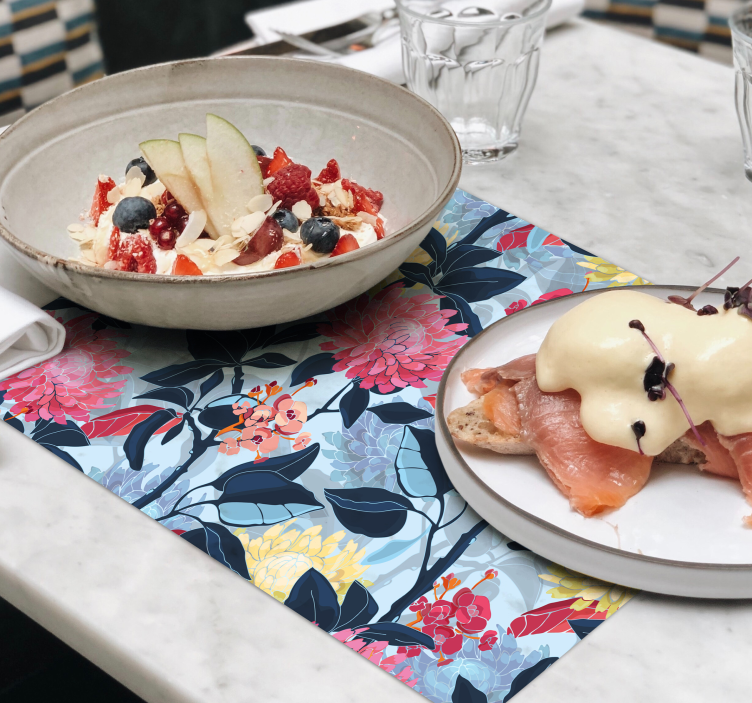 Referencia: M3699Un cautivador patrón floral que presenta exuberantes flores en tonos de rosa y amarillo, entrelazadas con profundas hojas verdes. Este diseño evoca una sensación de frescura y vitalidad, perfecto para realzar las experiencias gastronómicas. Su intrincado detalle añade elegancia e invita la atención a cualquier mesa.