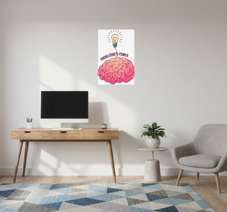 Referencia: G702Un espacio de trabajo moderno cuenta con un escritorio de madera con una computadora y material de oficina, creando una atmósfera acogedora. El arte de la pared muestra una ilustración vibrante de un cerebro acompañado de una bombilla, lo que simboliza el concepto de que el conocimiento empodera. Este diseño enfatiza la creatividad, la motivación y el crecimiento intelectual.