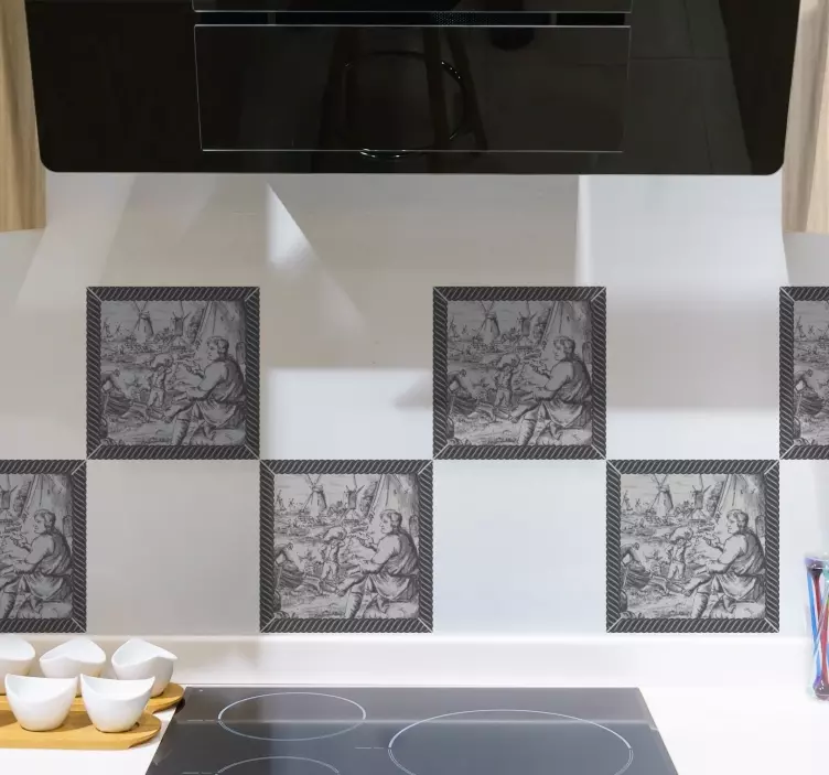 Descubre nuestro azulejo adhesivo escenas históricas, una obra maestra que combina un diseño laboral y artístico en un hermoso patrón en blanco y negro. Este estampado evoca la esencia de la artesanía y la cultura a través de escenas de hombres y molinos, creando un paisaje histórico que transformará cualquier espacio en un lugar lleno de historia y carácter.