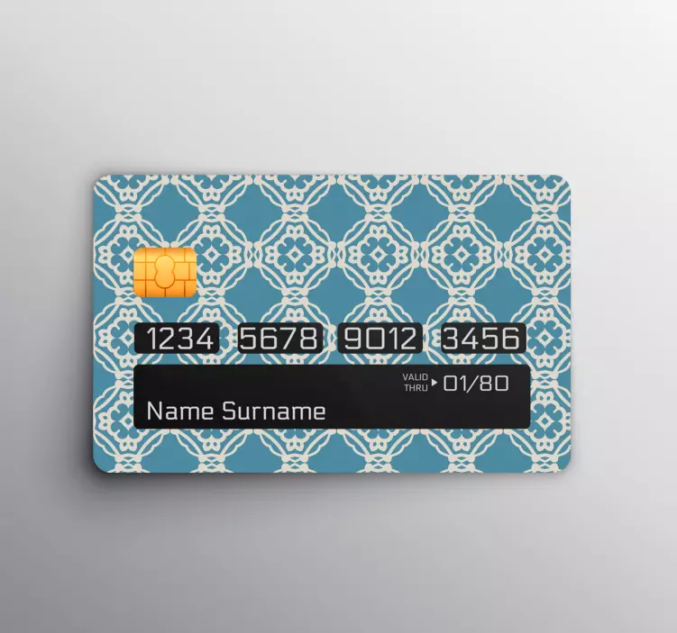 Transforma tu tarjeta de crédito con nuestro Sticker para tarjeta de crédito con diseño, un adhesivo que combina un hermoso patrón ornamental en tonos azules, inspirado en azulejos antiguos. Este diseño gráfico geométrico no solo embellece tu tarjeta, sino que también proporciona una textura única que la hará destacar en cualquier situación. Personalízala y dale un toque especial que refleje tu estilo y personalidad.