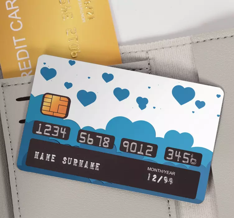 Descubre nuestro Sticker para tarjeta patrón de nubes con corazones, un adhesivo encantador que transformará tu tarjeta de crédito en una expresión de amor y alegría. Con un diseño juguetón que combina nubes suaves y corazones vibrantes en tonos azules, este vinilo es perfecto para quienes desean añadir un toque personal y divertido a sus tarjetas. ¡Deja que tu personalidad brille con este diseño único!