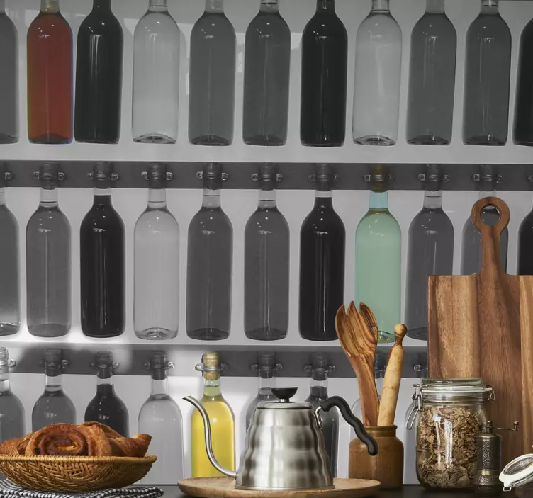 Referencia: A902Vinilos murales exclusivos realizados por el estudio fotográfico de Elisenda Bañón y Marc Guiu con una representación de una estantería con botellas de vino colgadas. Este vinilo pared es ideal para cualquier tipo de estancia en tu casa o para darle un aire moderno a tu bodega.