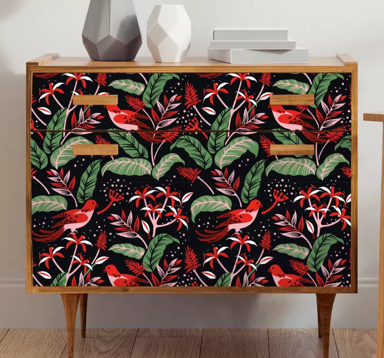 Transforma tu espacio con nuestro vinilo concepto floral tropical, un diseño vistoso que resalta la belleza de la naturaleza. Este llamativo estampado presenta hojas exuberantes y aves coloridas que aportan un toque vibrante a tus muebles. Con su combinación de tonos rojos y verdes, este vinilo es perfecto para quienes buscan una decoración tropical que evoque la frescura de un paraíso natural.