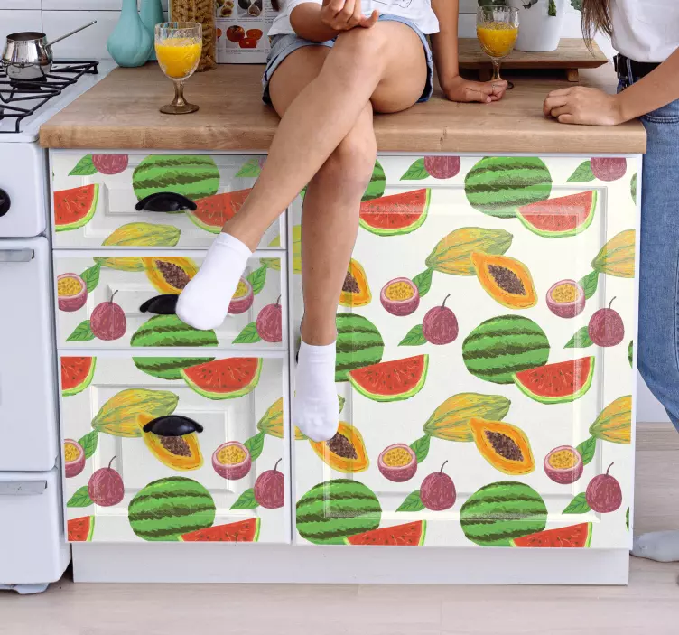 Transforma tu espacio con nuestro Vinilo de fruta creación de motivos frutales, donde cada diseño vibrante se llena de energía tropical. Este llamativo estampado presenta refrescantes sandías, exóticas papayas y cítricos limones, creando un patrón que no solo embellece tus muebles, sino que también añade un toque de alegría a tu hogar. ¡Atrévete a decorar con este mueble que evoca la frescura de un verano eterno!