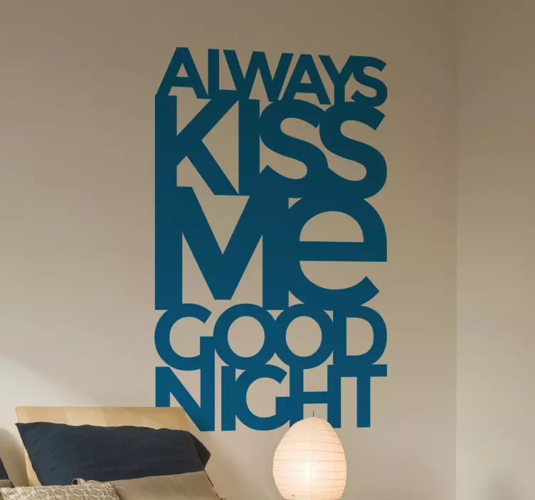 Referencia: A7691Diseño original de tenvinilo.com disponible en gran variedad de tamaños y colores de manera que pueda encajar estupendamente con la estética general de tu cuarto. Celebra cada día el amor con este adhesivo en inglés que viene a decir “bésame siempre, buenas noches”.