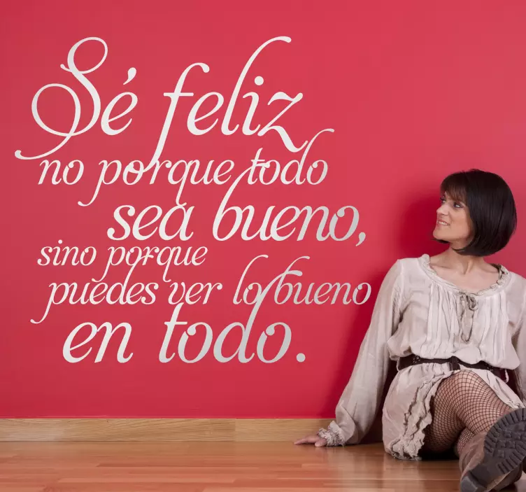 "Sé feliz no porque todo sea bueno, sino porque puedes ver lo bueno en todo". Vinilos motivacionales con un elegante diseño disponibles en gran variedad de medidas y más de cincuenta colores distintos ideales para la decoración comunes de casa como el comedor o el salón.