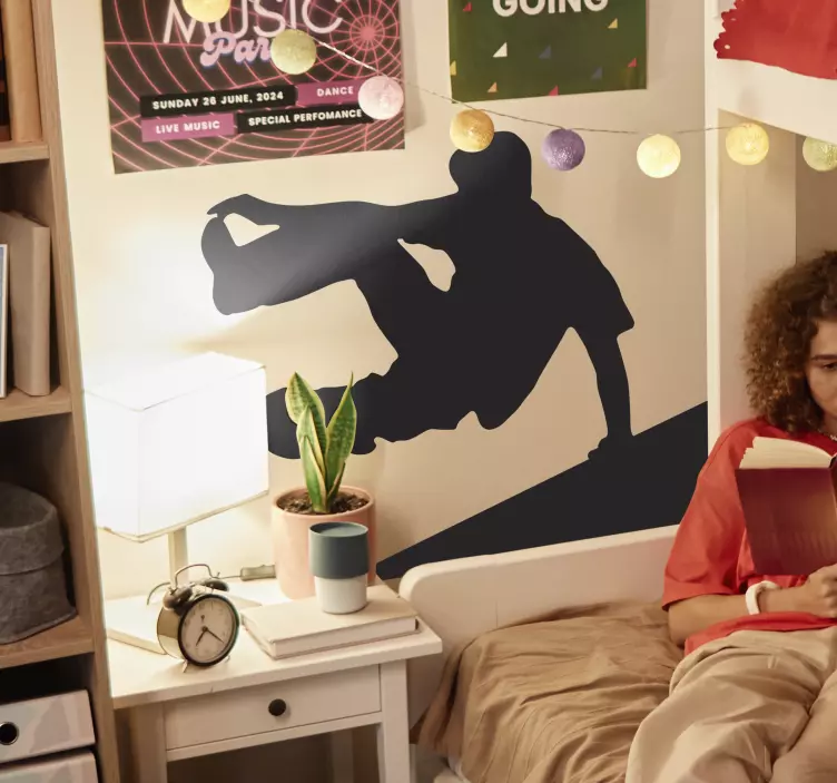 Referencia: A7549Pegatina disponible en una gran variedad de medidas y colores destinada sobretodo a un público joven, aficionado a este alternativo y arriesgado deporte urbano que consiste en desplazarse con agilidad por la ciudad sorteando muros y mobiliario dando acrobáticos saltos y volteretas. Vinilos juveniles ideales para una habitación aunque, en medidas pequeñas, también pueden usarse para decorar tu coche o tu moto haciendo ostensible cuál es tu afición.