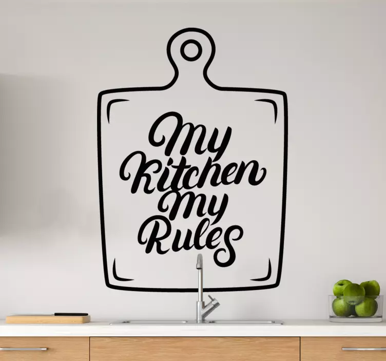 Referencia: A50665Una expresión vibrante para los entusiastas de la cocina, con la frase 'My Kitchen My Rules.' Este diseño llamativo añade un toque personal a los espacios de cocina, promoviendo la creatividad y la libertad culinaria.
