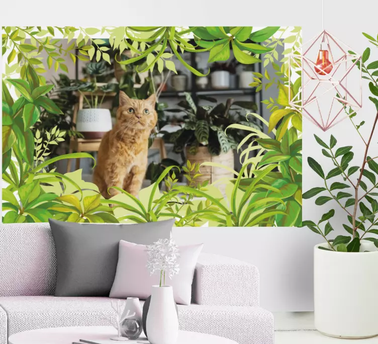 Referencia: A48313Una escena encantadora que presenta a un gato atento rodeado de exuberante vegetación. El diseño captura la esencia de la naturaleza entrelazada con la comodidad del hogar, mostrando la curiosidad del gato en medio de una variedad de plantas de interior.