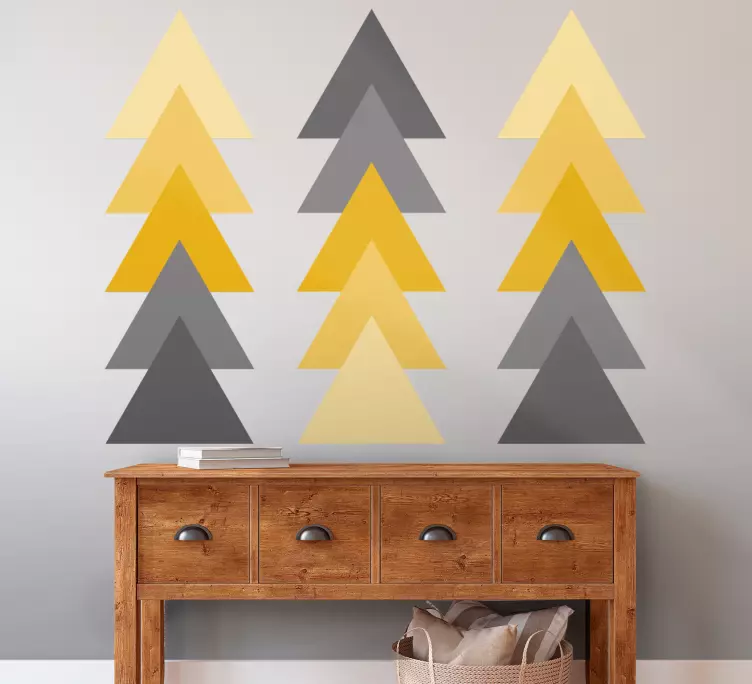 Transforma tu espacio con nuestro vinilo geométrico diseño de patrones triangulares, que presenta un atractivo gráfico lleno de flechas, triángulos y un diseño abstracto. Este patrón decorativo en tonos amarillos y grises brinda un estilo moderno y vibrante, ideal para quienes buscan un toque de geometría en su decoración. ¡Es perfecto para darle vida a cualquier habitación!