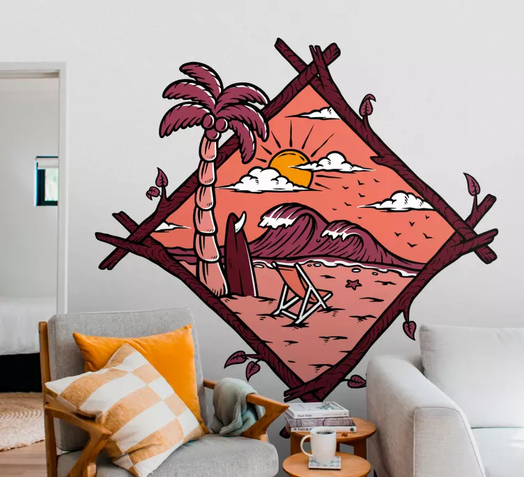 Descubre el encanto de la Vinilo naturaleza escena de playa tropical, una maravillosa representación gráfica que te transporta a un atardecer en una playa de ensueño. Este diseño vibrante muestra a un solo disfrutando de la brisa marina, mientras las ondas acarician la orilla. Con la silueta de una palmera y una silla de playa que invitan a la relajación, el fondo montañoso completa esta escena tropical que captura la esencia de la naturaleza.