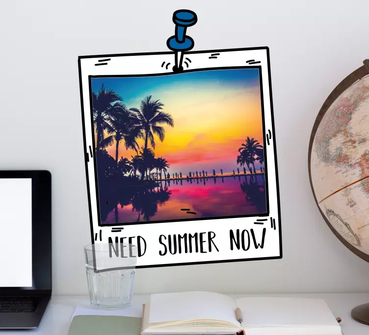 Descubre la magia del verano con nuestro Vinilo naturaleza marco paisaje veraniego, un diseño que captura la esencia de un atardecer en la playa, rodeado de palmeras y vibras de verano. Esta hermosa composición en forma de polaroid, junto con un texto inspirador, transforma cualquier espacio en un refugio de calma y relax. Con su intensa fotografía, cada vez que lo mires, sentirás que estás disfrutando de un perfecto día de verano.
