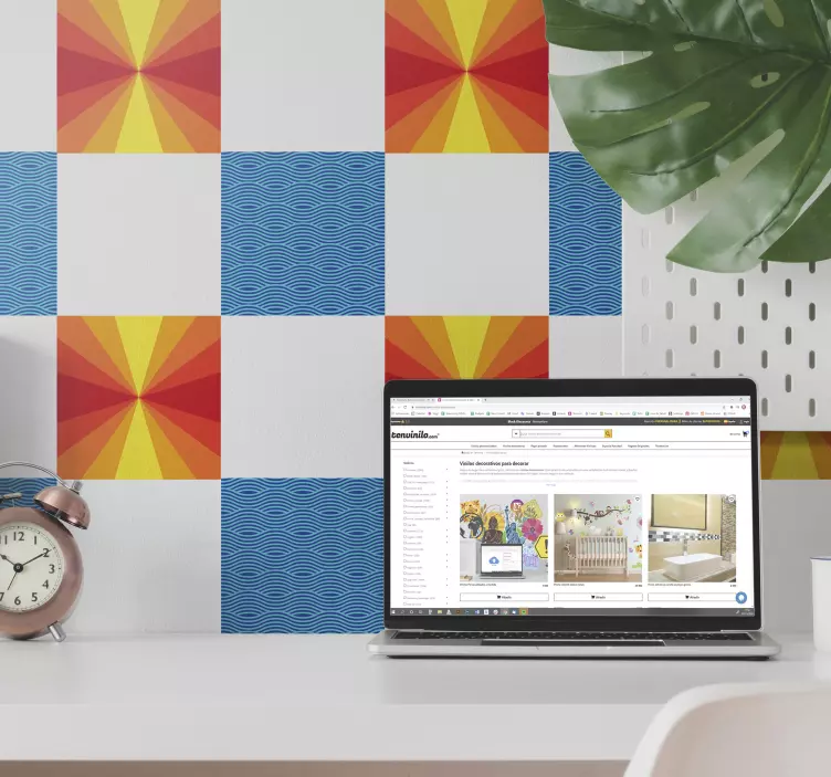 Descubre la belleza de nuestro vinilo ornamental composiciones geométricas vibrantes, donde los patrones cuadrados y las cuadrículas se combinan en un diseño moderno y abstracto. La imagen evoca la calidez de un atardecer con ondas que dan vida a un estampado vibrante y vistoso, perfecto para quienes buscan una decoración única y llena de energía.