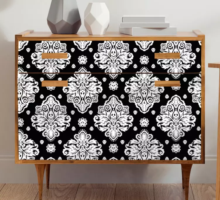 Descubre un mundo de elegancia con nuestro vinilo para mueble con diseño elegante. Este impresionante diseño presenta un patrón ornamentado que combina calaveras y elementos florales, todo en un sofisticado blanco y negro. El estilo moderno del estampado florido se adapta perfectamente a cualquier interior de la casa, transformando tus muebles en auténticas obras de arte. Deja que tu hogar hable de tu estilo único!