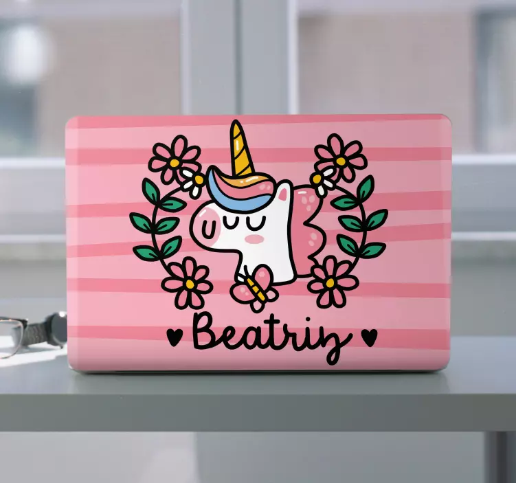 Descubre la magia del vinilo para portátil diseño floral de unicornio, una pieza encantadora que transforma tu ordenador portátil en una obra de arte. Con un fondo en tonos rosa y rosado, este diseño presenta un adorable unicornio rodeado de flores vibrantes y rayas caprichosas. Su estilo único te permite garabatear tu nombre o incluso añadir un nombre personalizado, haciendo que este vinilo sea no solo personalizable, sino también un reflejo de tu personalidad. Es un diseño lindo y vistoso que alegrará tus días!