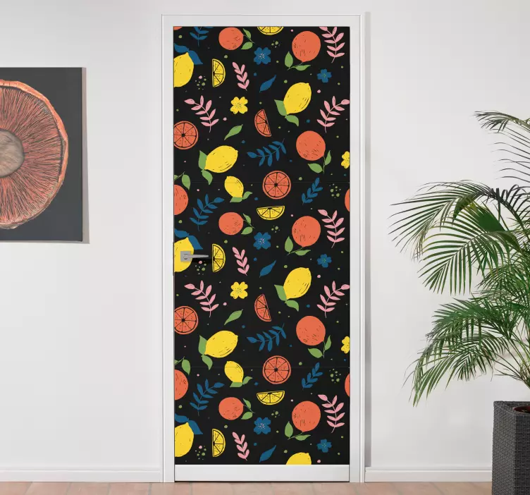 Descubre el vibrante vinilo para puerta patrones cítricos coloridos, un adhesivo que transforma tu espacio con un diseño gráfico alegre y fresco. Este vinilo presenta una encantadora ilustración de frutas como naranjas y limones, creando un patrón floral que resalta sobre un fondo negro. Los colores vibrantes de los agrios aportan una energía única, perfectos para dar vida a cualquier puerta.