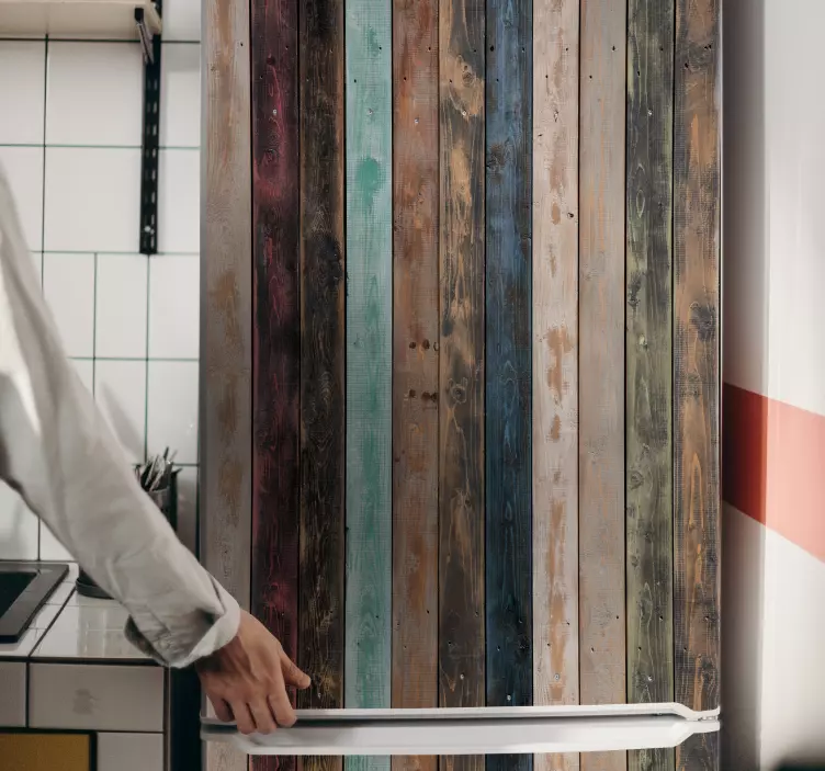 Transforma tu espacio con el Vinilo para refrigerador tableros de madera rústicos, un diseño que evoca la calidez de la madera natural. Este hermoso vinilo presenta un acabado pintado en vertical, imitando tablones de madera que aportan un toque rústico y vistoso a tu refrigerador, nevera, frigorífico o heladera. Su textura texturizada hace que te sientas en un acogedor interior de campo, ideal para añadir personalidad a tu cocina.
