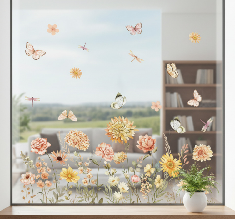 Vinilo para ventana pradera de flores con mariposas