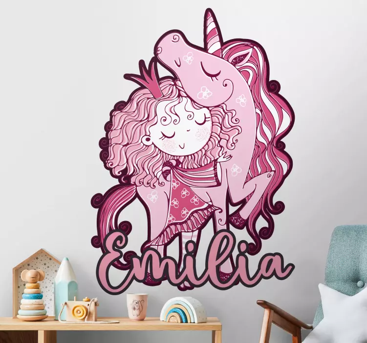 Descubre la magia de la decoración infantil con nuestro vinilo pared infantil abrazo de unicornio rosa. Este encantador diseño presenta a una muchacha soñadora en un mundo de dibujos animados junto a su princesa unicornio, creando un ambiente lleno de fantasía y alegría. Personaliza el nombre de tu pequeño en esta obra caprichosa y personalizable, ideal para darle un toque único a su espacio.