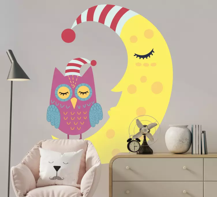Descubre la magia de la noche con nuestro Vinilo pared infantil búho somnoliento luna. Este encantador diseño presenta un lindo búho dormido bajo una hermosa luna, en un estilo de dibujos animados que iluminará el cuarto de los niños. Con colores vistosos, este vinilo se convierte en el elemento perfecto para transformar la habitación en un acogedor refugio nocturno.