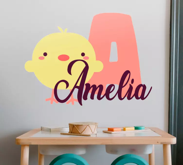 Referencia: A48924Un encantador diseño de pollito presenta un amigable pollito amarillo junto a una inicial colorida y un nombre personalizable. Este elemento juguetón es perfecto para crear una atmósfera encantadora en el espacio de un niño, añadiendo calidez e individualidad a su habitación.