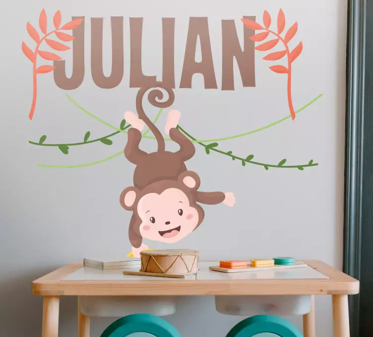 Referencia: A49357Un diseño encantador que presenta a un lindo mono colgado boca abajo de una enredadera. El diseño incluye hojas vibrantes y una opción de personalización, lo que lo hace perfecto para espacios infantiles. La expresión juguetona del mono añade un toque alegre a cualquier entorno.