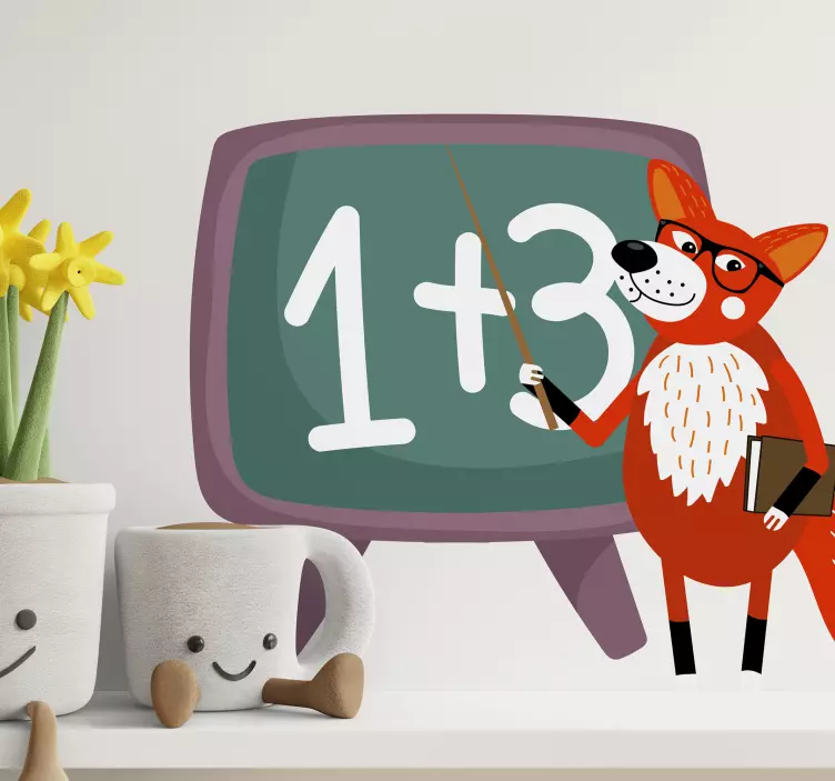 Este vinilo pared infantil zorro juguetón educador presenta un diseño encantador que combina elementos de cómic con un simpático zorro que actúa como profesor en una divertida clase de Matemáticas. Este animal salvaje, estilizado en dibujos animados, se convierte en un personaje interactivo ideal para la habitación de los niños, promoviendo la educación de una manera lúdica y atractiva.