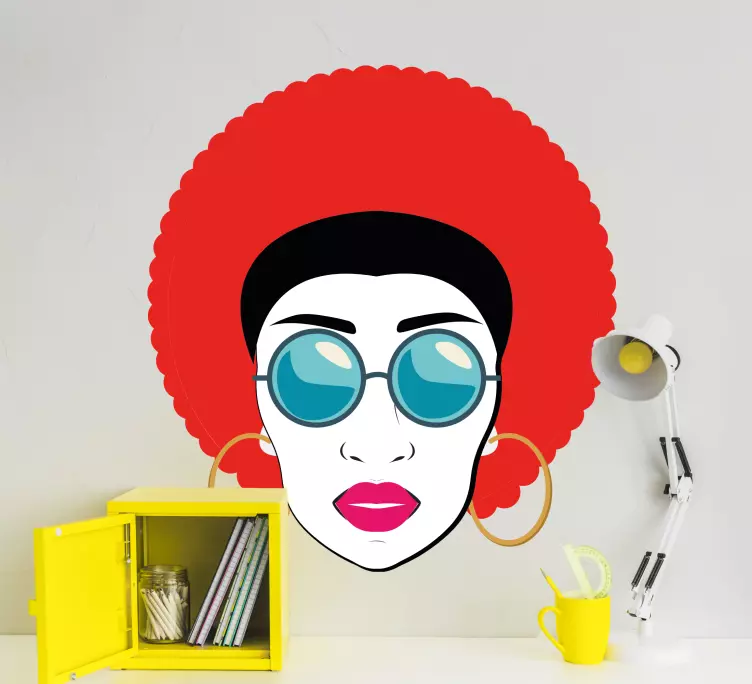 Referencia: A48099Una representación impactante de una mujer con un peinado afro oversized, que completa un look a la moda con gafas de sol y aretes de aro. Los colores vibrantes evocan una sensación de confianza y celebración, encarnando un estilo audaz que capta la atención.